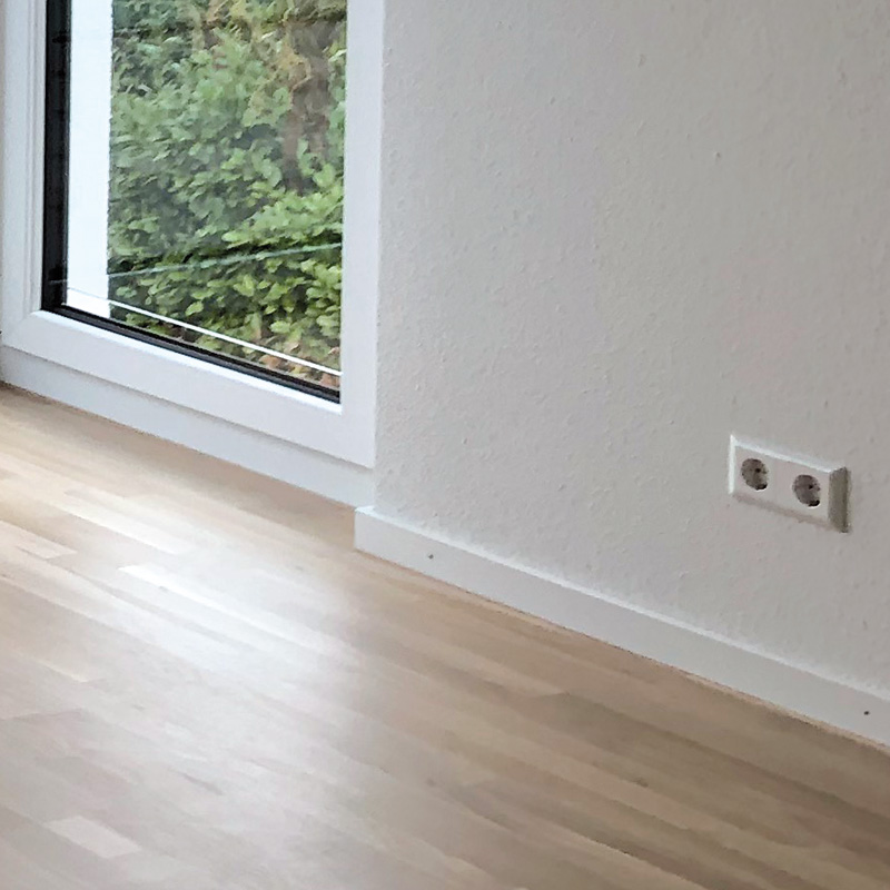 Standardmäßig ist in den Wohn-/Essbereichen und Schlafräumen ein Fertigparkett Eiche Einstab nach Mustervorlage BPD vorgesehen. Die Sockelleisten entsprechen der BPD Mustervorlage und sind in Eiche natur oder weiß erhältlich.